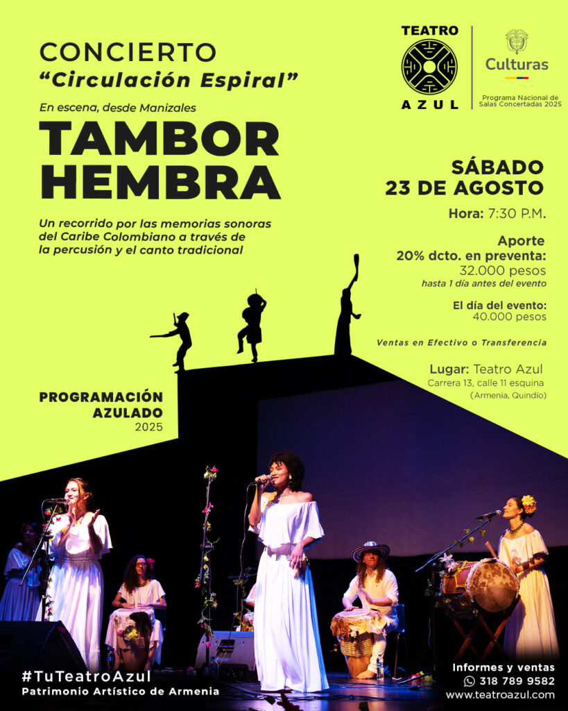 La agrupación manizaleña TAMBOR HEMBRA Presenta Circulación Espiral, un concierto que recorre las memorias sonoras del Caribe colombiano a través de la percusión y el canto tradicional. En escena, el tambor se convierte en cuerpo, raíz y palabra viva: una expresión colectiva que pulsa con fuerza desde lo ancestral hacia lo contemporáneo.